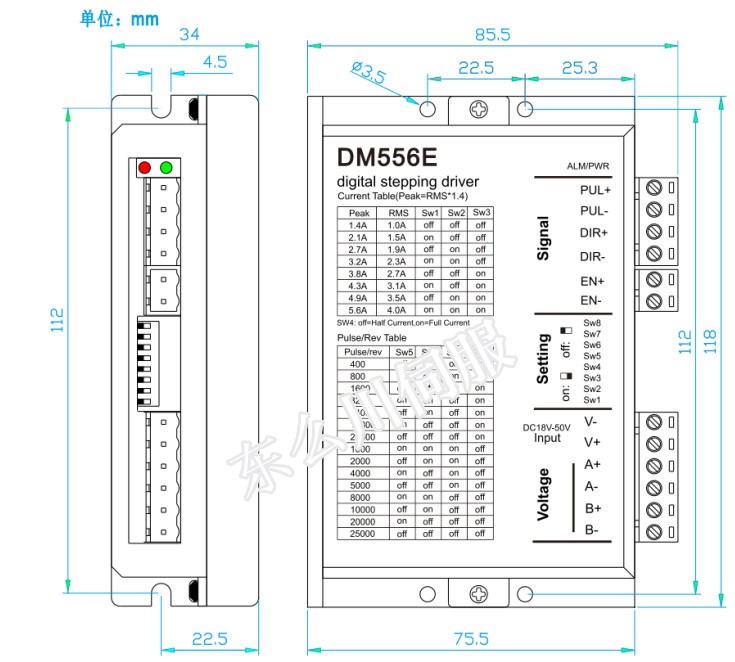 DM556E/DM756A型驅(qū)動器 具有更低的電機發(fā)熱、運行噪聲和更高的平穩(wěn)性,以及更低的成本,主要驅(qū)動57,86型兩相混合式步進(jìn)電機。其微步細(xì)分?jǐn)?shù)有15種,最大步數(shù)為25000Pulse/rev;其工作峰值電流范圍為1.4A-5.6A,輸出電流共有8檔,電流的分辨率約為0.6A;具有自動半流,過壓和過流保護(hù)等功能。本驅(qū)動器為直流供電,建議工作電壓范圍為24VDC-50VDC,電壓不超過70VDC,不低于20VDC。