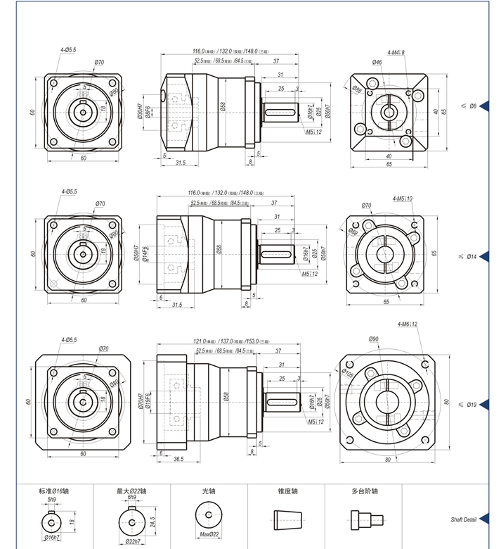●轉動慣量:指減速機輸入端啟動需要的慣量值,樣本上均指輸入軸徑為Ø14時的結果。